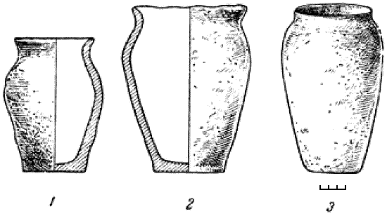 1, 2 – сосуды из зарубинецкого могильника у с. Корчеватого; 3 – урна из кургана 1 у с. Корчака.