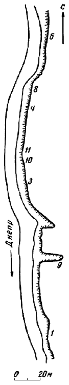 [Закрыть]. Расстояние между отдельными жилищами составляло 10–70 м. Другого рода построек выше по склону берега выявить не удалось. Разведывательные траншеи, заложенные в 1956 г. перпендикулярно линии берега, на некотором расстоянии от него, показали, что культурный слой далеко в глубь террасы не идет и отличается бедностью находок; в 30 м от берега он исчезает полностью. Все восемь открытых построек были одного типа – одинаково ориентированные полуземлянки, опущенные своей нижней частью в материковый лёсс.
