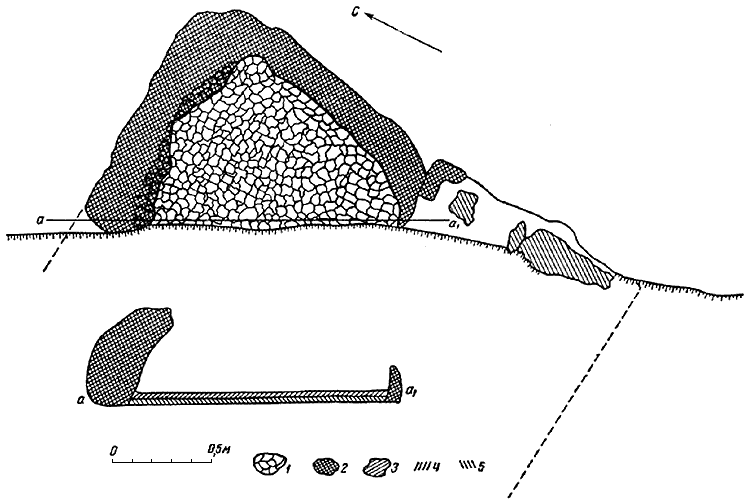 [Закрыть] (рис. 11, 1). Сохранилась примерно половина полуземлянки прямоугольной формы, ориентированной с севера на юг с небольшим отклонением к северо-западу. Длина восточной ее стенки 2,85 м (сохранилась полностью), северной – 0,8 м, южной – 0,55 м. Земляной пол находился на глубине 0,52 м от современной поверхности. Стены прослеживались на высоту 20 см от пола. Северо-восточный угол жилища занимали остатки печи, примыкавшей к стенкам. Она имела прямоугольную форму. Сохранился лишь глиняный под печи размерами 1,35×1,15×0,12 м, который подстилал слой толщиной 25 см из глины и песка, перемешанных с мелкими камнями. У устья печи, обращенного к югу, лежали на полу семь гранитных камней, частично перекрытых подом, образуя фундамент устьевой ее части. В гумусном заполнении постройки было очень много костей животных и рыбьей чешуи. Встречались также обломки гончарной керамики и камни. В юго-восточном углу на полу лежали два камня и обломок гончарного сосуда желтоватого цвета из хорошо отмученной глины с примесью черных частичек, с гладкой поверхностью, орнаментированной поясками из слабо заметных частых прямых и волнистых линий (рис. 10, 12). У пола полуземлянки были найдены сероглиняное плоское днище, плоское днище толстостенного сосуда желтоватого цвета, обломок стенки сосуда, сплошь орнаментированный многорядной волной и горизонтальными бороздками, сильно отогнутый венчик, под которым имеется ряд ногтевых вдавлений, обломок стенки красноглиняной амфоры с гладкой поверхностью.