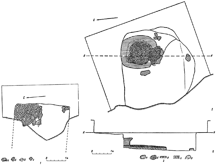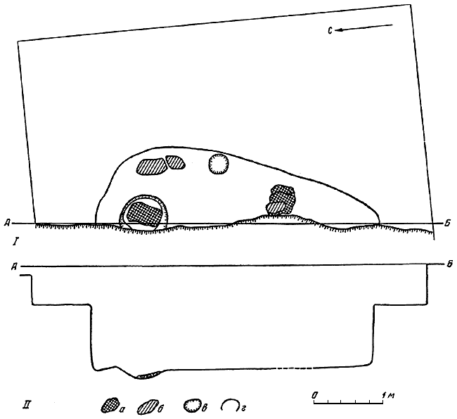 2 – постройка 8: I – план; II – разрез по линии АБ (а – камень; б – под печи, верхний слой; в – средний слой пода; г – нижний слой пода; д – свод печи).