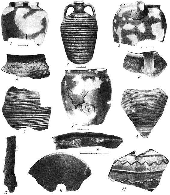 Обломки гончарных горшков, изготовленных на ручном гончарном круге, обильно орнаментированных волнистым и линейным орнаментом, а иногда гребенчатыми отпечатками, напоминают частью славянскую, частью салтовскую керамику конца I тысячелетия н. э.[415]415