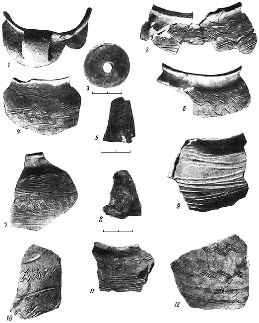 1, 2, 4, 6, 7, 9, 10–12 – керамический материал; 3 – пряслице, изготовленное из стенки амфоры; 5, 8 – бронзовые трапециевидные пластинки.