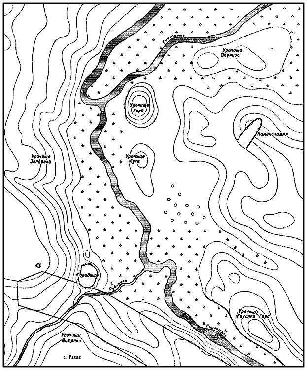 Археологические находки разного времени у с. Райки расположены на обоих берегах р. Гнилопяти и ее небольших притоков Пятки и Рублянки. Среди многочисленных памятников, обнаруженных археологической экспедицией Института археологии АН УССР, которая здесь работала ряд лет, наиболее исследованным является раннефеодальное городище, размещенное на левом берегу Гнилопяти у северной окраины села (рис. 1).