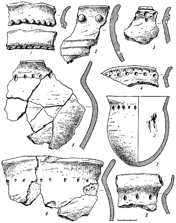 Рис. 3. Керамика милоградского типа эпохи раннего железа из Луки-Райковецкой (1–8).