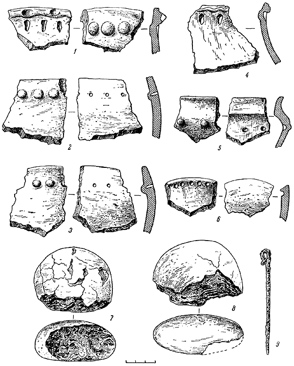 [Закрыть]. Вместе с упомянутой керамикой эпохи раннего железа повсеместно на урочище Лука-Райковецкая была выявлена керамика с жемчужным орнаментом, защипами и пальцевыми вдавлениями на шейке или венчиках. Часть такой керамики имеет лощеную поверхность (рис. 3, 1–4). К памятникам эпохи раннего железа в Луке-Райковецкой следует отнести найденную в одном из шурфов железную шпильку с загнутой в петлю головкой (рис. 4, 9). По-видимому, к этому же времени следует отнести и круглые, немного приплюснутые с одной или с обеих сторон керамические грузила, без отверстий (рис. 4, 7, 8).