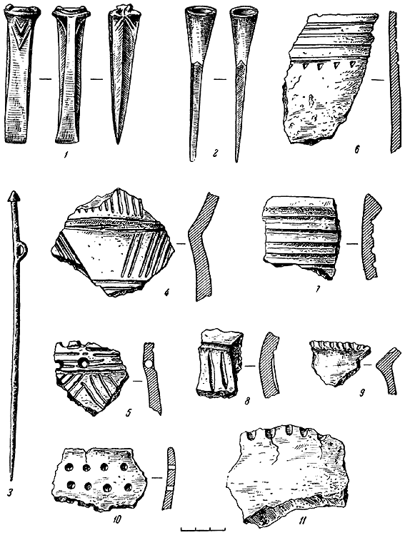 Рис. 5. Находки эпохи бронзы и раннего железа из Луки-Райковецкой (1-11).