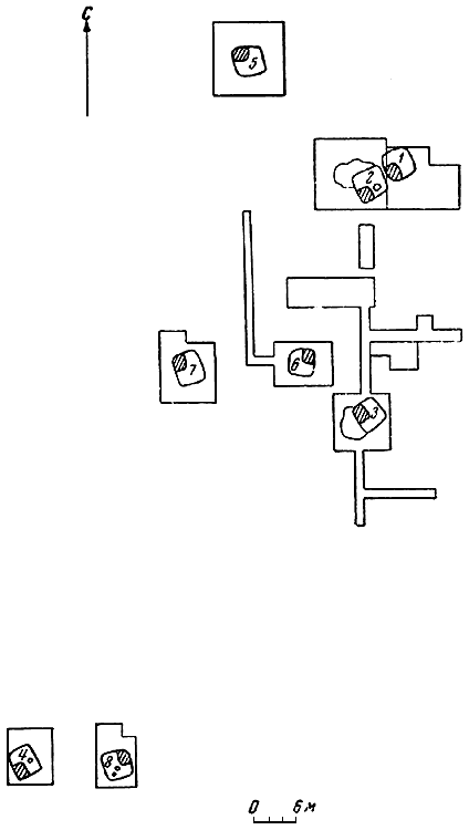 Нами была произведена тщательная разведка шурфами и траншеями разных частей урочища. На местах темных пятен, выявленных на материке, были разбиты раскопы (рис. 6)[478]478