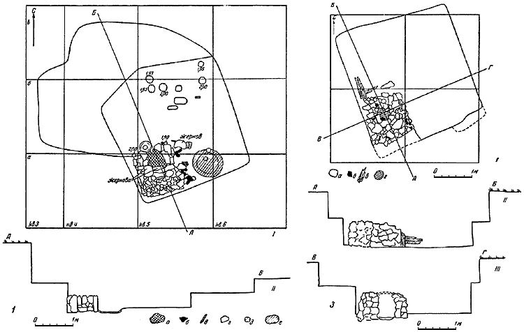 2 – жилище 3: I – план; II – разрез по линии АБ; III – разрез по линии ВГ.