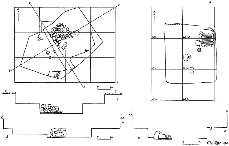 3 – жилище 4: I – план; II – разрез по линии АБ; III – разрез по линии ВГ (а – камни; б – фрагменты керамики; в – обгорелое дерево; г – под печи).
