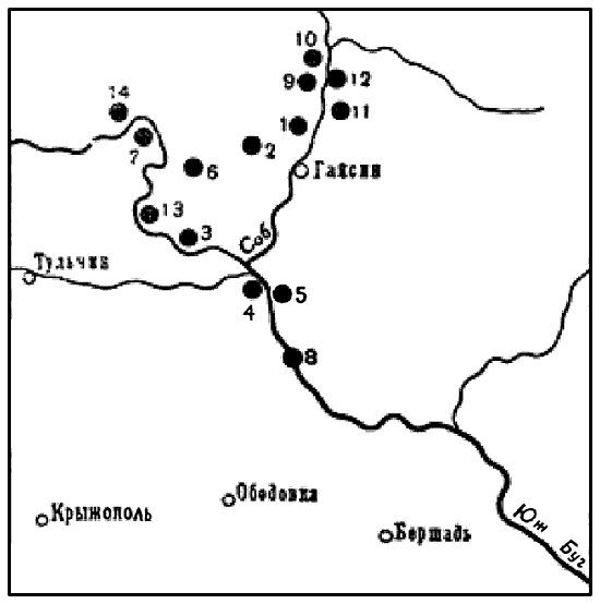 1 – Кисляк; 2 – Гайсин; 3 – Харпачка; 4 – Ладыжин, урочище Швейцария; 5 – Губник, урочище Сажевка; 6 – Шуровцы, урочище Березина; 7 – Семенки; 8 – остров Мытковский, с. Скибинцы Тростянецкого района; 9 – Карбовка, урочище Царина; 10 – Бондуры; 11 – Кисляк II; 12 – Гунча; 13 – Степашки Гайсинского района; 14 – Самчинцы Брацлавского района Винницкой обл.