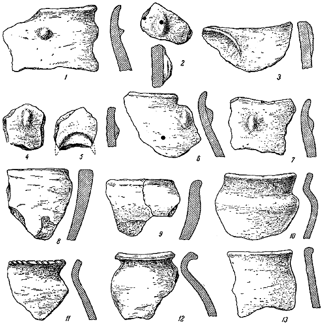 Жилище 12, последнее из раскопанных в 1960 г., находилось в восточной части поселения, в 20 м от берега реки. Оно было разрушено в период существования поселения. Печь сохранилась лишь в основании, сложенном из мелких камней. Внутри прослежен плохо сохранившийся под. Прямо перед печью лежал большой фрагмент сосуда из темно-коричневой глины, со слегка отогнутым венчиком и суживающейся ко дну нижней частью. По краю венчика нанесен орнамент из пальцевых вмятин (рис. 8, 10). Справа от устья печи лежала куча больших камней, свалившихся с ее стен. На полу найдено четыре фрагмента керамики. Ни контуров углубления, ни размеров жилища, хотя бы по полу, проследить не удалось. Ям от столбов не обнаружено. Вероятно, по своей конструкции жилище 12 относится к типу срубных углубленных построек.