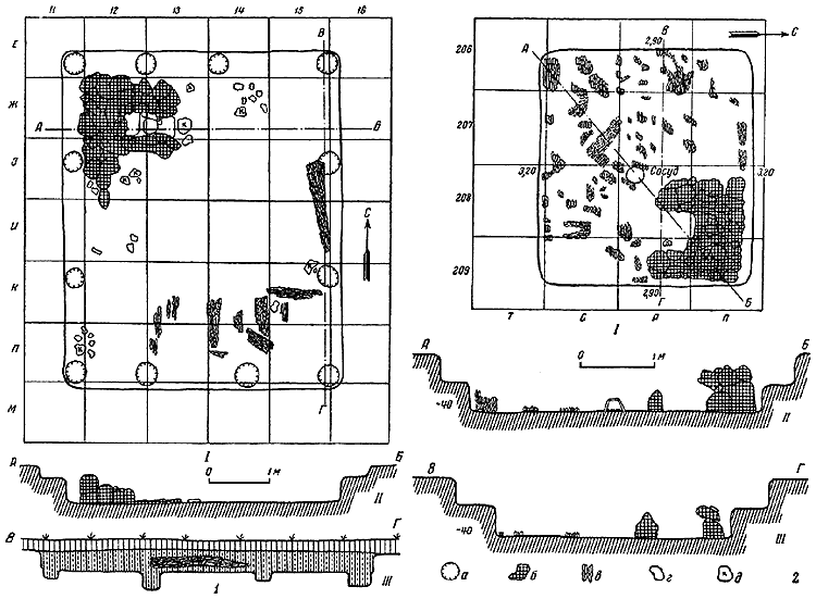 1 – жилище 4: I – план; II – разрез полнили АБ; III – разрез по линии ВГ;