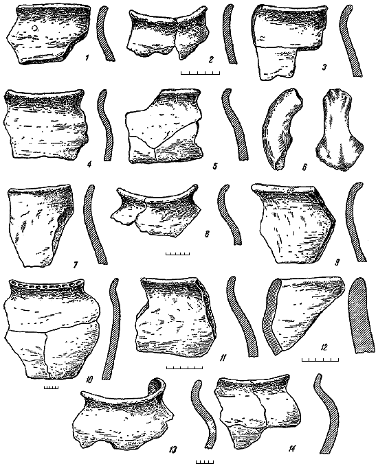 1 – жилище 4; 2 – жилище 7; 3, 4 – жилище 8; 5, 6 – жилище 9; 7, 8 – жилище 10; 9, 11, 12 – жилище 11; 10 – жилище 12; 13, 14 – хозяйственные ямы.
