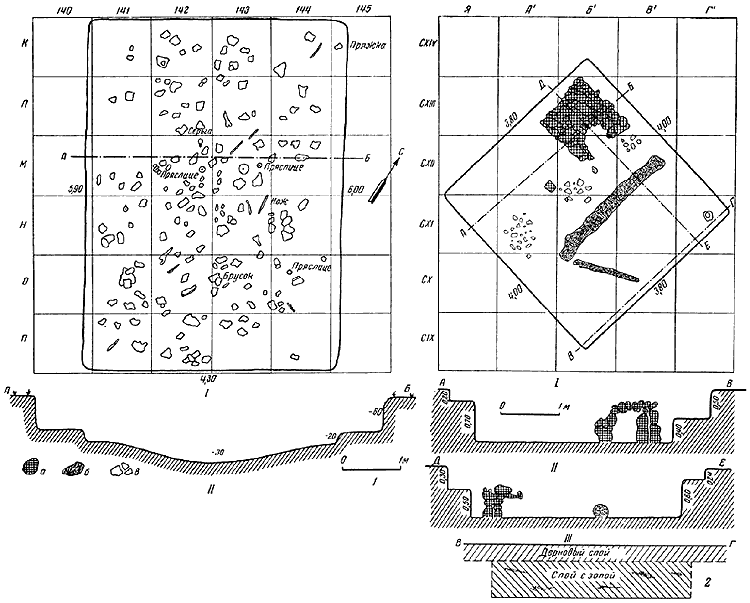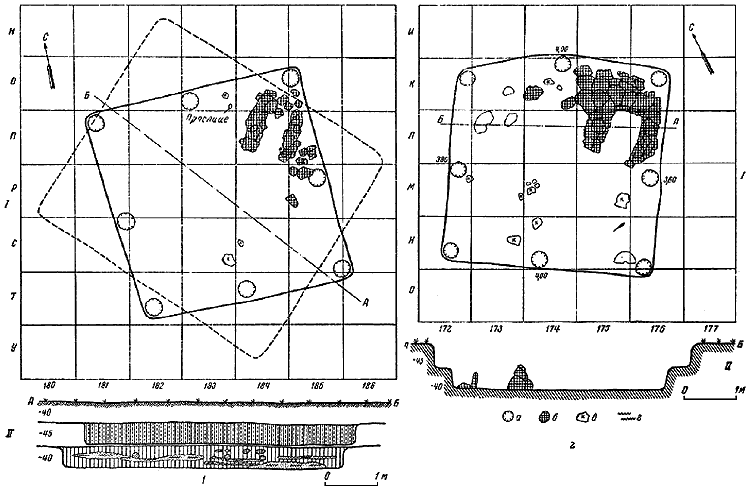 1 – жилище 9, перекрытое постройкой 7: I – план; II – разрез по линии АБ;