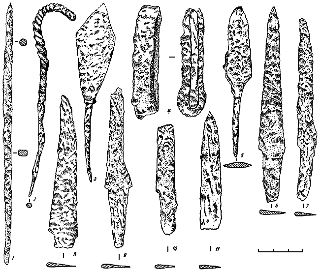 1, 2 – железные предметы; 3, 5 – наконечники стрел; 4 – железная поделка из Соменок; 6, 8-11 – железные ножи из Семенок; 7 – железный нож из Самчинец.