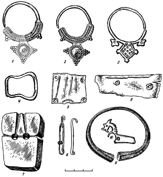 1, 3 – подвески из Семенок; 2 – подвески из Пастырского городища (по Б.Н. и В.И. Ханенко); 4 – пряжка; 5, 6 – медные бляшки из Семенок; 7 – литейная форма; 8 – язычок от пряжки; 9 – бронзовый браслет с острова Мытковского, Скибинцы; 10 – изображение лошади из Самчинец.