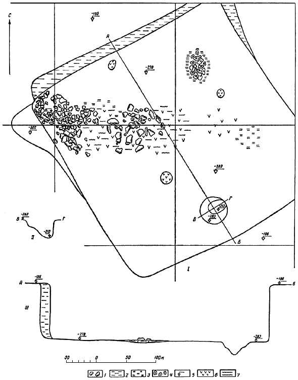 [Закрыть]. Вход в жилище обнаружен не был. Возможно, им служил уступ, найденный у западного угла жилища. Он имел треугольную форму и глубину 0,20-0,25 м от поверхности материка. Но если считать этот уступ входом, то вызывает недоумение его расположение непосредственно над развалом печи-каменки. Развал этот обнаружен в западной части жилища. Он тянулся с запада на восток, к центру полуземлянки и состоял из двух групп камней. Западная представляла собой группу камней, средний размер которых был равен 0,07-0,10 м. Камни лежат плотной кучей. Восточная группа состояла из камней размером 0,10-0,15 м, лежащих несколько более разрозненно. Пространство между этими группами было покрыто золой и углистым слоем. Зола и уголь в большом количестве находились и между камнями. Весь развал печи занимал в длину с запада на восток 2,35 м, ширина его составляла около 0,70 м. У восточного конца развала, в центре жилища, имелось углубление неопределенных очертаний, также заполненное золой и угольками. Оно, по-видимому, образовалось при вытаптывании пола перед печью в период существования жилища. В северной части полуземлянки находился небольшой (0,40×0,60 м) яйцевидный в плане очаг с серой плотной обмазкой толщиной около 2 см. Материковая глина пола вокруг него была обожжена докрасна. Ярко-красное пятно прожженной глины диаметром около 0,40 м находилось также на полу в 1,20 м к юго-востоку от очага. Между ним и очагом имелось черное углистое пятно. Здесь же была небольшая ямка (диаметр около 0,10 м) глубиной в 7 см, заполненная таким же углистым слоем. Еще две такие ямки располагались к северу и к юго-востоку от развала печи. Первая – продолговатая, глубиной 2 см, вторая – круглая, диаметром 0,20 м глубиной 8 см. Около юго-восточной стены находилась яма диаметром 0,45 м и глубиной 0,30 м, сужавшаяся к своей северо-западной стороне до 0,20 м в поперечнике. Полуземлянку заполнял плотный чернозем. В нем было много угольков и кусочков обожженной глины, но следов пожара не прослежено. По-видимому, жилище было просто заброшено.