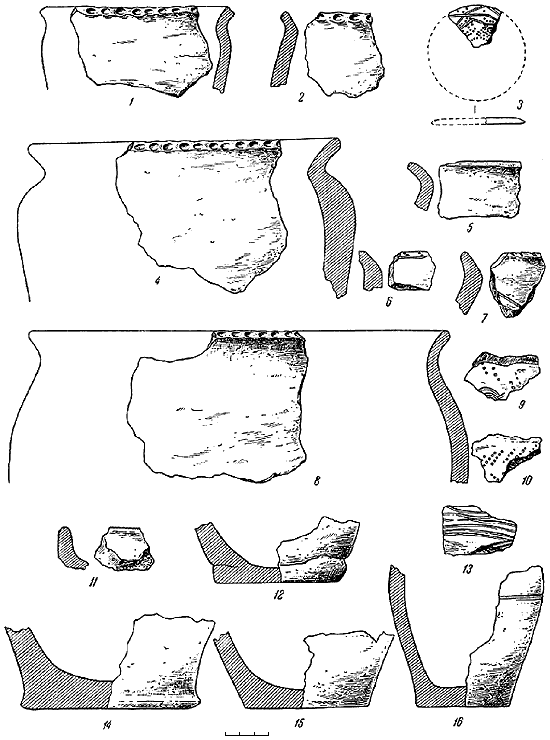 В жилище 1 найдено 150 обломков керамики. Материал в массе своей однороден. Это грубая лепная посуда с очень неровной поверхностью серого или желтого цвета с темными пятнами. Глина содержит примесь крупного шамота. Толщина стенок сосудов 1–1,5 см. Обжиг неравномерный и несквозной. Техника лепки ленточная. Она особенно хорошо прослеживается на одном обломке донца, где четко видно место соединения первой ленты с дном (рис. 2, 12). Основная форма посуды – горшки разных размеров (диаметр устья до 30 см). Среди них можно выделить два основных типа: 1) горшки со слабо отогнутым венчиком, почти без плеч (рис. 2, 1, 2), горшки с сильно отогнутым венчиком и хорошо выделяющимися плечиками (рис. 2, 4, 8). Найденные донца тоже двух форм: прямосрезанные (рис. 2, 15–16) и слегка обжатые внизу (рис. 2, 14). Большая часть венчиков орнаментирована пальцевыми вдавлениями по краю. Кроме того, есть один обломок венчика с косыми насечками (рис. 2, 7) и один с парными наколами по краю (рис. 2, 6). Встречен также венчик с гладко срезанным краем (рис. 2, 5). На обломках стенок преобладает прочерченный линейный орнамент (рис. 2, 13). На трех обломках имеются наколы зубчатым штампом, причем на одном из них эти наколы сочетаются с прочерченными линиями (рис. 2, 9, 10). Кроме горшков, встречен один маленький обломок края сковородки (рис. 2, 11) и четыре амфорные стенки. Найден также обломок плоской крышки диаметром 7 см (рис. 2, 3). Крышка в середине украшена наколами, а по краям ломаными перекрещивающимися прочерченными линиями.