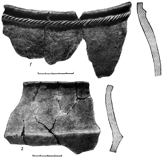 Рис. 5. Керамика из среднего слоя городища у дер. Демидовки (1, 2).