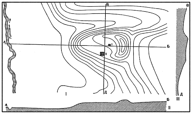 1 – яма; 2 – шурф 1957 г.