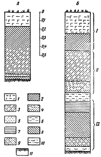 1 – однородный темно-серый грунт (перепаханный); 2 – серый перемешанный грунт; 3 – темно-серый гумусированный грунт; 4 – серовато-оливковый грунт; 5 – песок; 6 – песок с суглинком; 7 – темный гумусированный слой; 8 – серый грунт; 9 – коричневатый грунт; 10 – зольный слой; 11 – материковый суглинок.