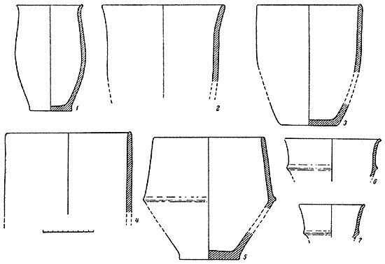 2. Баночные плоскодонные сосуды средней величины (рис. 3, 3, 4). Тулово этих сосудов от дна до одной третьей высоты немного расширяется, а затем становится цилиндрическим, венчик прямой.