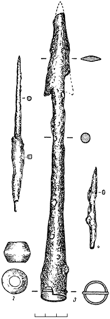 Железный наконечник копья довольно массивный, втульчатый, двушипный (рис. 4, 3). В нижней части втулки сохранился четырехугольный гвоздик, которым наконечник крепился к древку. Железное шило обычной формы (рис. 4, 1), оно имело округлое острие и четырехугольный черешок, вставлявшийся в деревянную рукоять. На черешке сохранились остатки дерева. Железный предмет (рис. 4, 4) скорее всего представлял собой какое-то острие, сохранившееся не целиком.