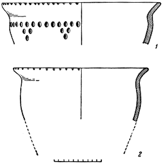 1. Слабопрофилированные плоскодонные сосуды средней величины (рис. 3, 1, 2). Тулово этих сосудов от дна к верху постепенно расширяется, затем идет несколько суженная горловина и слегка отогнутый наружу венчик. По соотношению ширины к высоте они могут быть приземистыми или очень вытянутыми.