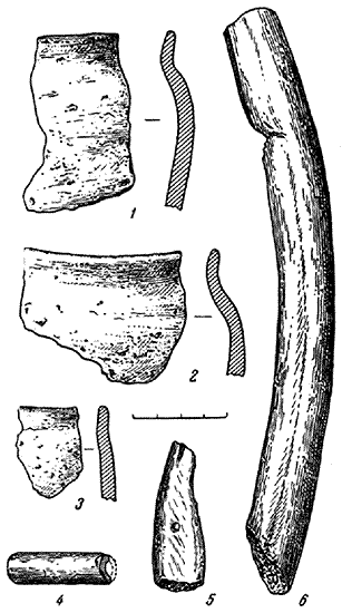 Нижний слой (третий от поверхности) содержал только слабопрофилированную гладкостенную керамику, характерную для древнейших городищ верховьев Днепра, возникших в средине I тысячелетия до н. э. (рис. 6, 1–3). Черепки в изломе темные, глина перемешана плохо, к ней добавлено значительное количество дресвы, поверхность слегка приглажена, но из-за большого количества дресвы, выступающей частично наружу, сделалась неровной, а сглажено-бугорчатой. Нижний слой изобиловал костями домашних и диких животных, в том числе: медведя, лося, кабана, лошади, коровы, овцы. Многочисленны находки костей и чешуи рыб. Встречены поделки из кости: пронизка, игла для вязания сетей, подвеска, тупик (рис. 6, 4–6).