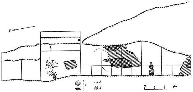 В 70 см к югу от северного развала, в слое беловатой супеси, на глубине 90 см, обрисовалась яма трапециевидной формы (длиной 1,20 и шириной 0,70-0,85 м). Она имела прямые стенки и плоское дно, расположенное на глубине 30 см от поверхности материка. В ней были найдены лишь три мелких толстостенных грубых лепных обломка керамики. По-видимому, здесь были вскрыты остатки наземного жилища, близкого по типу к жилищу Ново-Покровского поселения Харьковщины, открытого Ю.В. Кухаренко[144]144