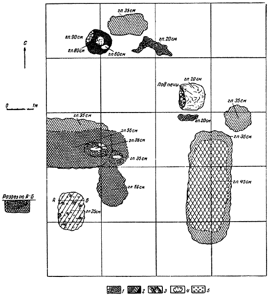 1 – обожженная глиняная обмазка; 2 – ямы; 3 – керамика под подом печи; 4 – мергель; 5 – глина.