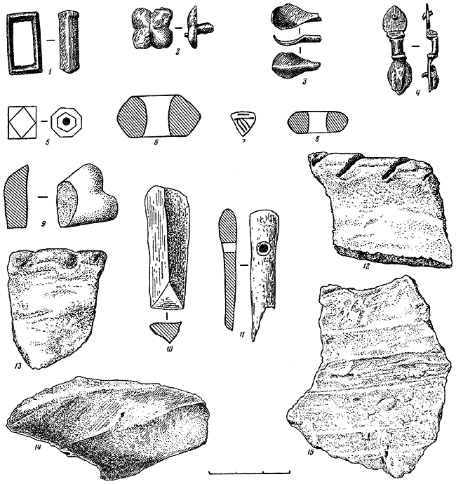 1–4 – вещи из могильника; 5-11 – находки на поселении: 5 – бусина; 6, 8 – глиняные пряслица; 7 – лопасть от бубенчика с крестообразной прорезью; 9 – обломок янтаря; 10, 11 – каменные оселки; 12, 13, 15 – лепная керамика черняховского времени; 14 – обломок гончарного лощеного сосуда.