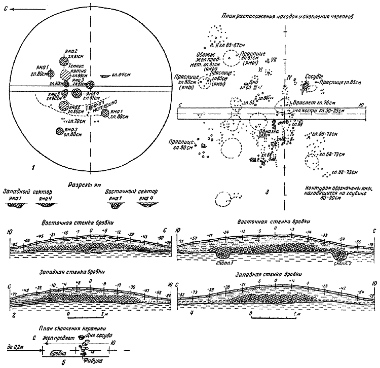 Курган круглый в плане, диаметром 12 м, высотой 80 см. Под основной насыпью на глубине 68 см было прослежено большое пятно темной земли с включениями угля, золы и скоплений керамики, которое перекрывало лежащие под ним погребальные ямки. Всего в кургане пять погребальных ямок – три в восточном секторе – № 1, 2, 3 и две в западном – № 4, 5 (рис. 2, 1). Ямки 2 и 4 в западном секторе представляли собой поверхностные пятна с включениями угля, а ямка 1, хотя и была углублена в материк и заполнена углем и золой, но кальцинированных костей в ней не было. Все погребальные ямки обнаружены на одной глубине – 80–83 см, на уровне горизонта и очень незначительно углублялись в материк, всего на 18–20 см. Диаметр их от 40 до 60 см, а в разрезе они линзообразные. Погребения здесь в большей своей части были женскими, – так, в ямке 1 (восточный сектор) вместе с кальцинированными костями найдены два пряслица и мелкие обломки, очевидно раскрошившихся от огня, синих стеклянных бус. В ямке 2, в том же секторе, тоже вместе с костями лежало одно пряслице. Вероятно, женским было погребение и в ямке 5 (западный сектор), так как к северо-западу от нее рядом со скоплением керамики на уровне поверхности ямки тоже лежало пряслице со следами пребывания в огне.