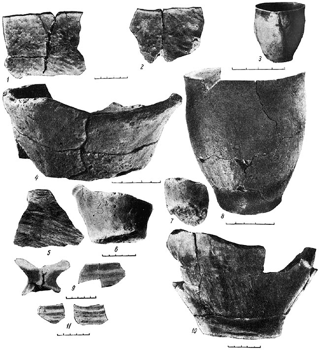 6. Прямая шейка с горизонтально или наклонно внутрь срезанным краем. Две из трех относящихся сюда шеек были сделаны из глины с примесью песка. Одна из них была украшена рядом подтреугольных ямок. У двух других орнаментировала вся шейка волнистым орнаментом. Кроме того, на одной по верхнему краю шел ряд овальных ямок и внизу по валику ряд косых насечек (рис. 3, 10).