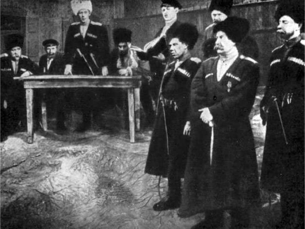 'Кубанцы' В. Ротко. Ленинградский Большой, драматический театр имени Горького. Художник А. Лентулов. 1938. Сцена из