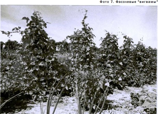 В свое время фасоль высаживается разумно густо по границам колец, окружающих нижние концы хворостин (на схеме кольца отмечены штриховыми окружностями), Как раз в момент, когда рисовалась схема, пришла к нам гостья. Увидев схему, она воскликнула: «Как красиво!». Мы пригласили её посетить нас летом и увидеть это вживе – вот тогда будет действительно чарующая красота! Наш огород живописен, как говорится, «в любое время суток». Всегда есть на чем глаз остановить – будь то ранняя весна или поздняя осень. Но грядка с фасолевыми «вигвамами» всё лето и осень, до самых заморозков – «понад усе». «Вигвамы» все лето буквально залиты цветущей фасолью (см. фото 7). Благодаря им созревающие стручки хорошо экспонируются, регулярно срезаются, и растения цветут и плодоносят до глубокой осени.