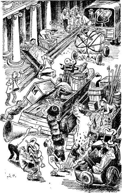 Перед крыльцом-перроном стоял караван автомобилей. Трепетал от нетерпения флажок на радиаторе протарзановского лимузина. Из машины выглядывала прямоугольная мохнатая морда Читы. Участники экспедиции неторопливо заняли свои места. Печальные ассистенты чинно восседали на «пикапах». цвета дорожной пыли. В трехосном грузовике, нервно обнимая хрупкую аппаратуру, разместились осветители. К машине была прицеплена специальная платформа. На ней, обложенный войлочными матрацами и запеленутый брезентом, высился «Племянник солнца». Колонну замыкали автофургоны звукооператоров.