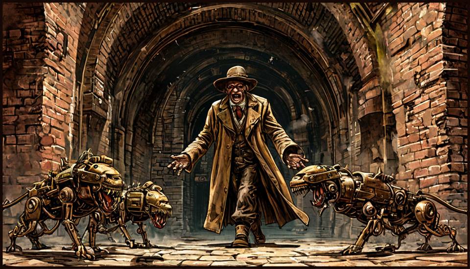 …Или… не существа? Морды, бока были составлены из клёпаных бронзовых пластин, четыре лапы блестели гидравлическими цилиндрами и витками мощных пружин. В глубоких прорезях, заменявших глаза, светило багровым, и отблески отражались на бронзовых полированных клыках, отчего те казались покрытыми кровью. Поначалу механические псы – именно такой термин сразу пришёл Петру в голову, – поначалу двигались несколько замедленно, даже неуклюже, скрипя при каждом шаге – словно разминая свои металлические сочленения, слишком давно пребывавшие без движения. НА с каждым шагом твари – механизмы? – восстанавливали утраченную гибкость; вот они уже разошлись полукругом, охватывая нарушителя с боков. Пётр, наконец, сообразил, что целью готовящейся атаки станет именно он, отшвырнул болгарку и заскрёб ногтями по крышке маузера. Гивс снова каркнул что-то неразличимое – в голосе явственно угадывалось злорадство, – и тут на него со спины обрушился Сергей. Рукоятка зажатого в кулаке пистолетикаударила Маячного Мастера сверху, согласно заветам лейтенанта Таманцева, чуть правее макушки. Герой богомоловского «Момента истины» не подвёл – Гивс мешком осел на пол, медальон из разжавшейся ладони полетел к ногам Казакова.