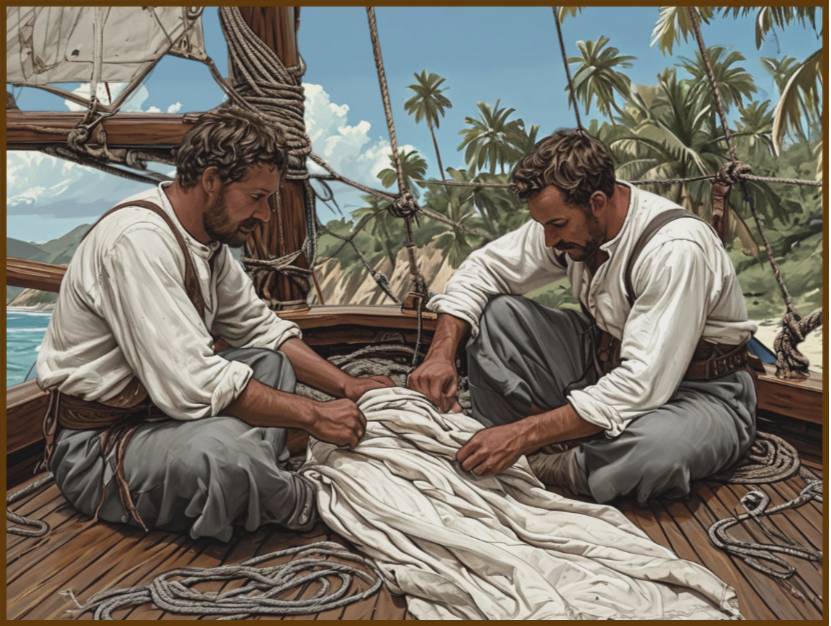 В лагуне тихо; «Ланифер» едва покачивается на стояночных якорях, собака Кора (она, едва заметив с маячного утёса вдали нашу яхту, примчалась в посёлок и с тех пор ни на шаг от нас не отходит) валяется на крыше рубки и улыбается на свой собачий манер. Мы с Петром сидим вот и сейчас мы сидим, скрестив ноги по-турецки, на полубаке и латаем стаксель при помощи заплат, вырезанных из грота – сам он ремонту не подлежал, разобранный на полосы бешеными шквалами на Фарватере. стаксель. Небо над головами по тропически бездонное, лёгкий ветерок разгоняет зыбь на океанском просторе, шелестит широченными листьями пальм на берегу.