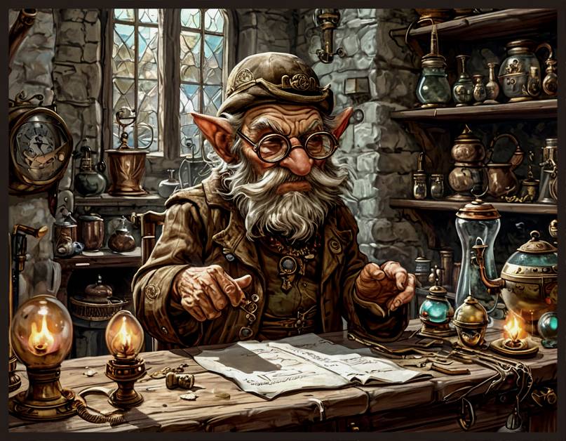 Мессир Дваркель принял гостей в своей лаборатории, куда нас проводила моя старая знакомая, то ли консьержка, то ли экономка старого гнома. На этот раз она обошлась без расспросов – только поджала губы в знак недовольства – «ходят тут всякие, занятых людей от дел отрывают!» – и посторонилась, пропуская нас на лестницу. На этот раз на голове у него вместо гномьего колпака была нахлобучена какая-то невнятная шляпа с крошечными измятыми полями и бронзовыми пряжками на тулье. В отличие от прежнего головного убора, шляпа прикрывала одну только макушку, выставляя на обозрение полупрозрачные, заострённые, необычайно длинные уши.