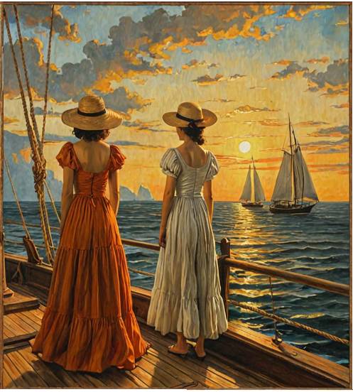 Женщины вновь появились на палубе, когда мы только-только поравнялись с «Морской звездой» – совершенно преобразившимися, в лёгких шёлковых платьях, складками спадающих до щиколоток – Тави в светло-сером с жемчужным отливом, казаковская пассия – в медно-оранжевом, словно облитом отсветами закатного пожара, разливающегося над бухтой. На головах у обеих были соломенные шляпки – всё же я оказался прав насчёт загадочных коробок! – украшенные атласными чёрными лентами, почти одинаковые, если не считать того, что у шляпки Веры Павловны поля были слегка приопущены, а у Тави – наоборот, загнуты с одного бока вверх.