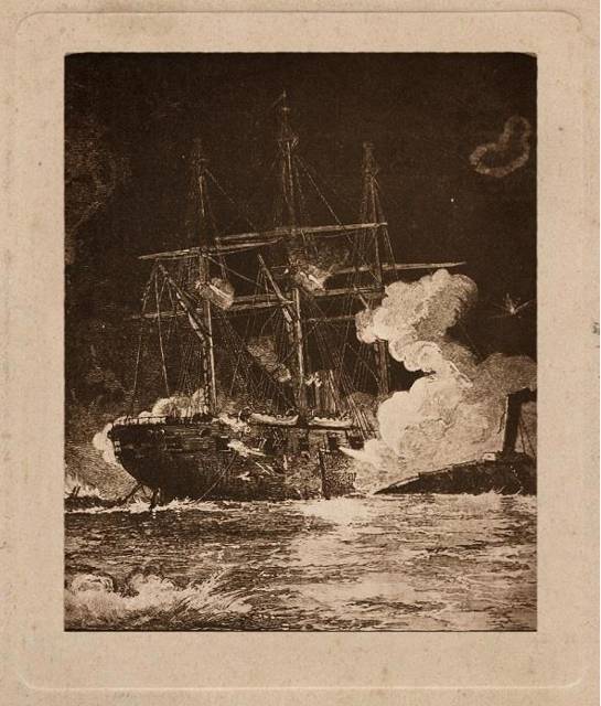 Попадание произвело на плавучий ресторан действие, схожее с тем, что производит удар кувалдой со всего маху по перезрелому арбузу. Вспышка разрыва, разлетающиеся во все стороны куски дерева, раскоряченные человеческие тела, рушащийся в воду мачта с вымпелом Таможенной службы. Видимо, многострадальная баржа стояла на достаточно мелком месте, и вместо того, чтобы затонуть, осела в воду по самую палубу. То, что осталось от ресторанной надстройки пылало страшно и жарко, густые клубы дыма плыли над рейдом, и из-за них продолжали лететь в сторону рейда и города чугунные, начинённые пироксилином «чемоданы».