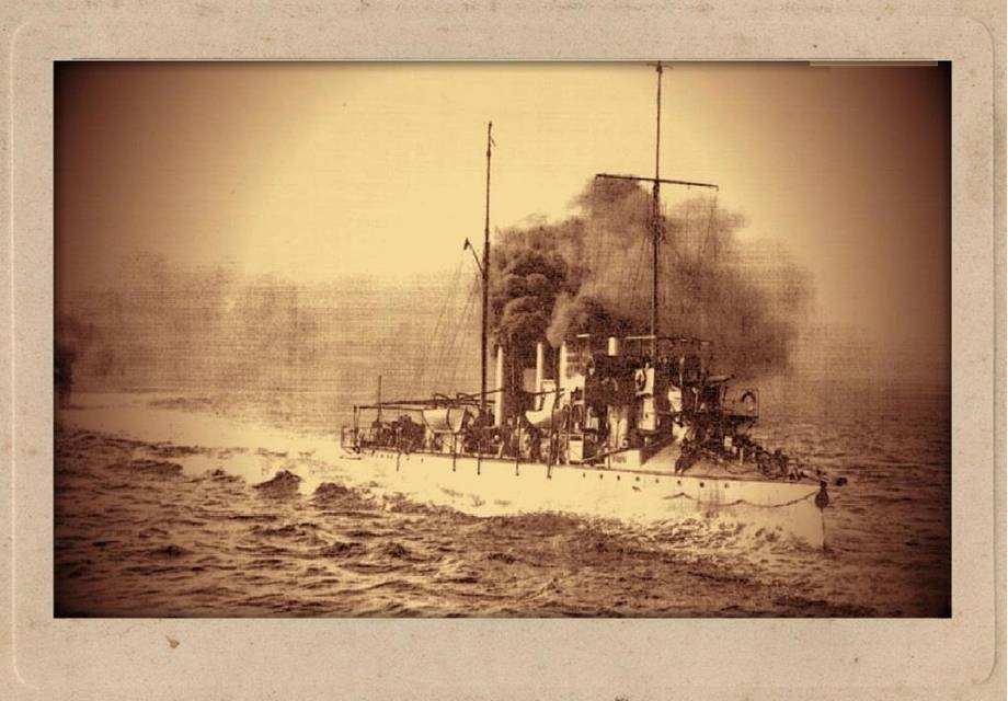 Градоначальник – дородный, лет шестидесяти, мужчина с роскошной гривой седых волос и бакенбардами а-ля Александр 2-й – тоже был в мундире, тёмно-синем, с золотыми пуговицами, без каких-либо знаков различия. В похожие мундиры была облачены и прочие присутствовавшие на встрече официальные лица – капитан порта и начальник гарнизона. За спиной градоначальника – тот принимал визитёров, сидя за необъятным письменным столом, украшенным бронзовым письменным прибором, – висела фотография, чёрно-белая, очень старая в простой чёрной рамке. На ней был изображён военный корабль – узкий, длинный, с четырьмя в ряд короткими трубами и небольшой пушкой на полубаке. Корабль шёл полным ходом, неся у форштевня высокий бурун; на кормовом флагштоке был ясно различим Андреевский флаг. Фотографию украшала надпись, выполненная старославянской вязью – «Живой».