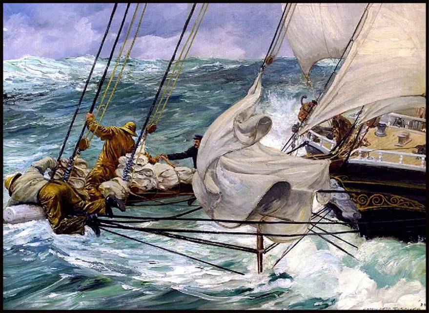 Парус, подчиняясь рывкам стаксель-нирала (снасти, предназначенной для спуска стакселя), пополз вниз по грота-штагу, собираясь у кончика бушприта большими складками. Теперь предстояло самое весёлое – вылезти туда и, повиснув над кипящей бездной, уложить парус, закрепив его шкертами, отрезками тонкого каната. Я перебрался через леера и полез по бушприту, хватаясь на снасти. Волнение усиливалось, шхуна то и дело ныряла носом в воду – и тогда нас – меня и моего напарника, матросаиз Зурбагана, которого Врунгель нанял всего месяц назад, с головой тнакрывало пенными потоками. Приходилось держаться изо всех сил – конечно, под бушпритом натянута предохранительная сеть, но срываться с бушприта, а потом барахтаться в её ячеях, захлёбываясь солёной океанской водой – удовольствие гораздо ниже среднего….