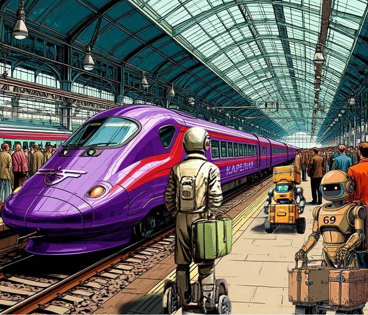 На поезд – длинный, ярко-фиолетовый, с и зализанными, как у реактивного самолёта, аэродинамическими обводами, мы успели в самый последний момент. Пониже алой полосы, тянущейся вдоль вагонов,большими белыми буквами было написано «Карелия»; я продемонстрировал проводнику билет; он мазнул сканером по квадратику QR-кода, покосился на собаку – Белька, успевшая позабыть о давешнем роботе улыбнулась в ответ в ответ до ушей, – и посторонился, пропуская нас в вагон. Мы прошли по узкому коридору; створка двери купе была предупредительно отодвинута вбок, и стоило мне поставить на койку чемодан и усесться самому (собака тут же принялась обнюхивать все доступные уголки) как поезд состав дёрнулся и покатил, постепенно набирая скорость.