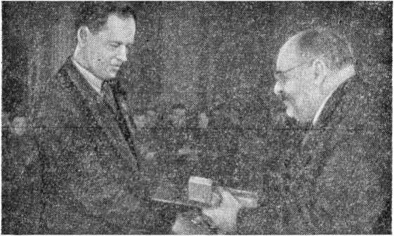Заместитель Председателя Президиума Верховного Совета СССР А. Е. Бадаев вручает А. Д. Швецову знаки отличия Героя Социалистического Труда. 1942 год.