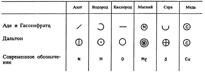 Первый значительный шаг в изображении химического состава веществ сделали во Франции инженер Жак-Анри Гассенфратц (1755–1827) и химик и врач Пьер-Огюст Аде (1763–1834). Они вместо алхимических символов веществ и семи металлов ввели обозначение известных химических элементов в виде дуг, черточек и кружочков, в которые помещали первую букву французского названия элемента. Из таких символов начали составлять химические формулы веществ. Затем Дальтон (см. 2.8) ввел в употг ребление свои символы химических элементов и также использовал их для обозначения состава веществ (табл. 2).