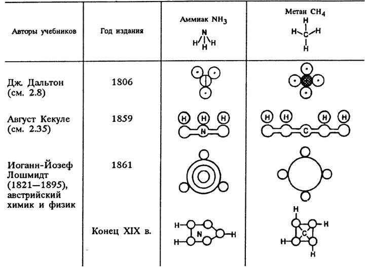 В табл. 3 представлена эволюция графических формул молекул аммиака и метана в учебниках химии XIX в.