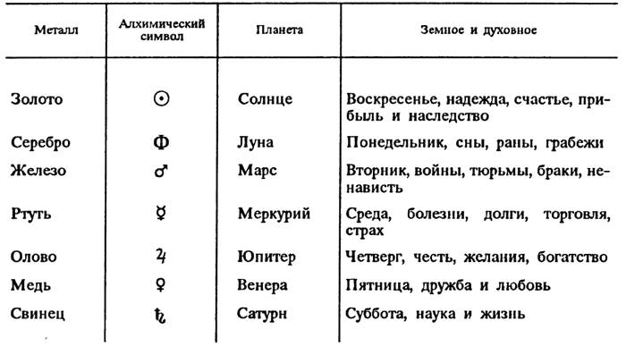 Алхимики считали, что в природе существует только семь металлов по числу известных в то время планет и что эти семь металлов связаны со средой обитания человека, его душевным состоянием, днем недели и космосом. Поэтому металлы имели названия соответствующих планет (табл. 1).