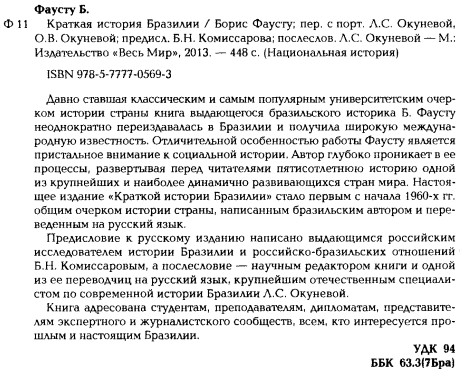 В своей книге Б. Фаусту в целях облегчения восприятия текста не использует точные библиографические ссылки. Основная литература размещена автором в конце оригинального издания книги на португальском языке и в русском издании не приводится. При подготовке русского перевода было сочтено целесообразным снабдить книгу перечнем основных работ по истории Бразилии отечественных авторов, подготовленным Л.С. Окуневой.